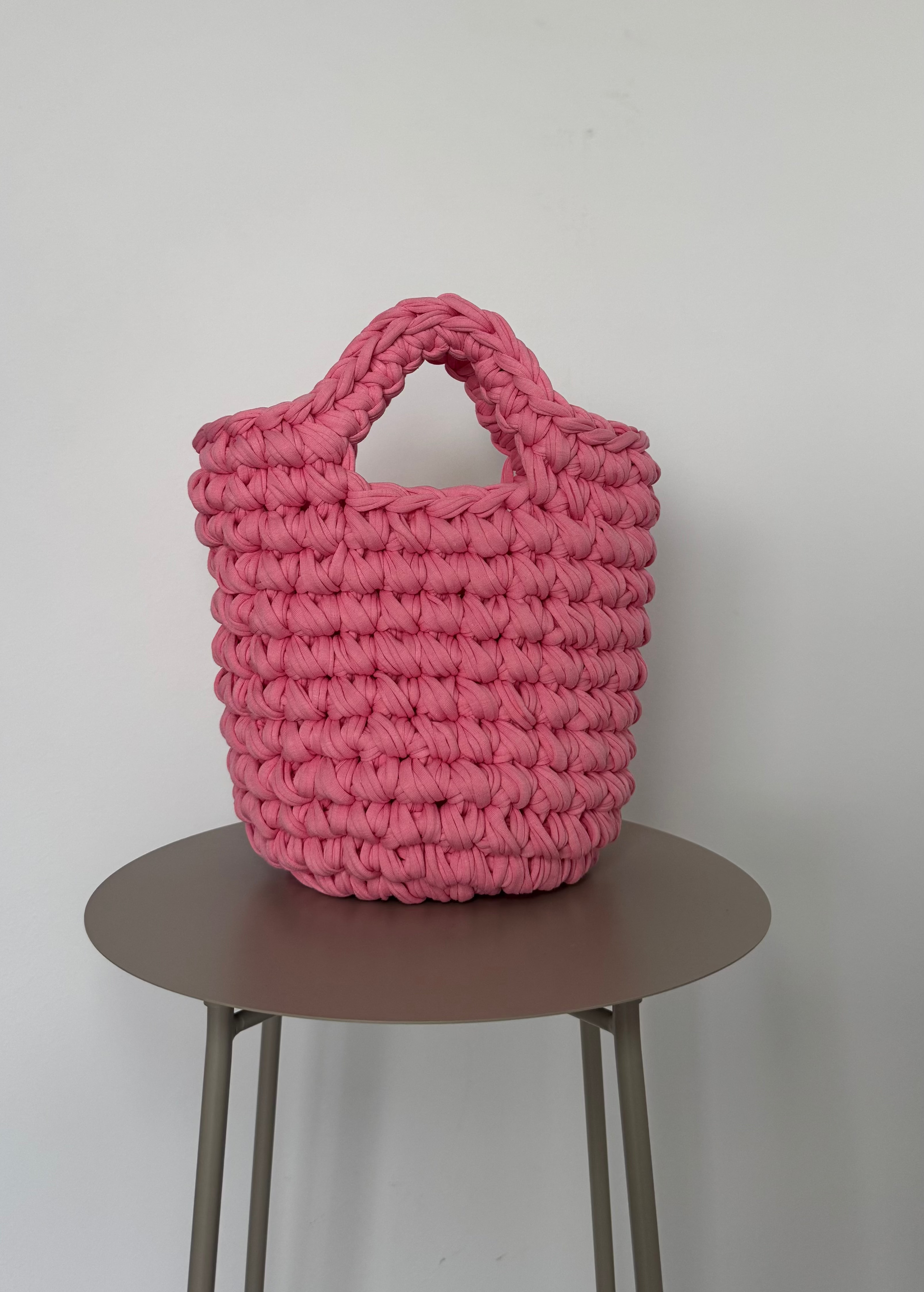 All bags are crocheted from recycled T-shirt yarn, giving them a soft texture and long-lasting structure.