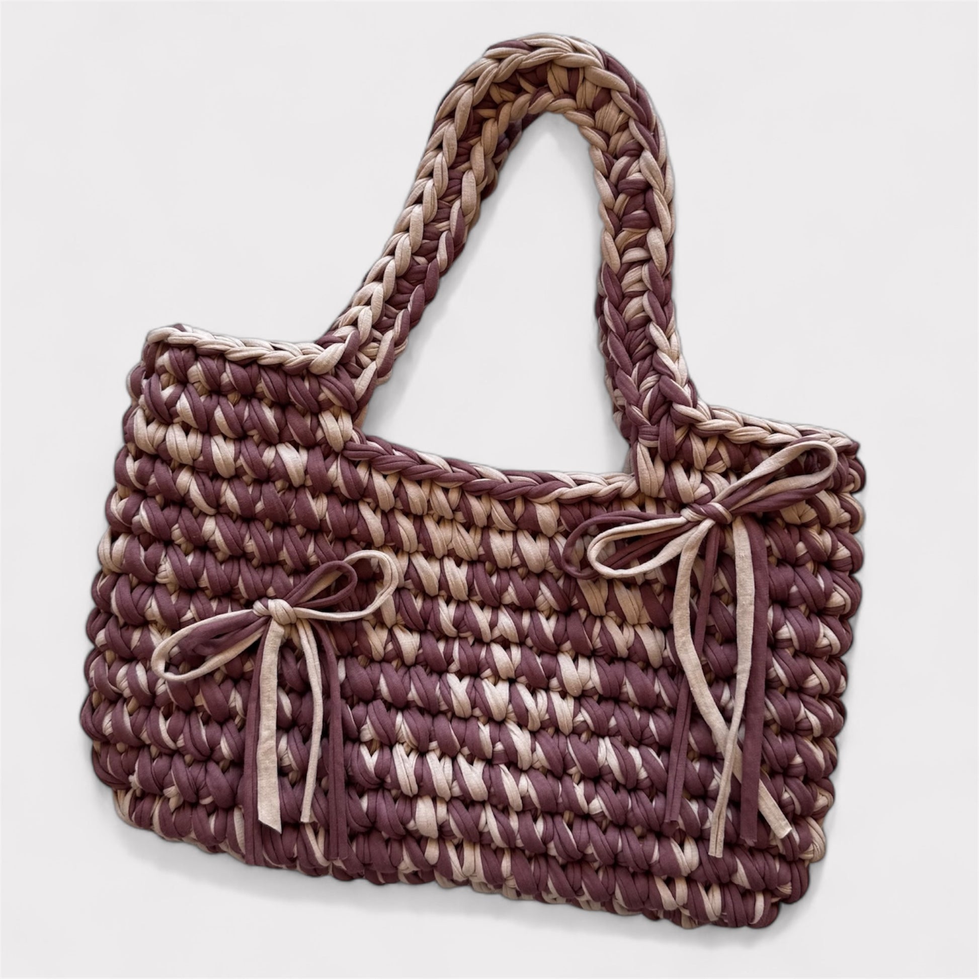 All bags are crocheted from recycled T-shirt yarn, giving them a soft texture and long-lasting structure.